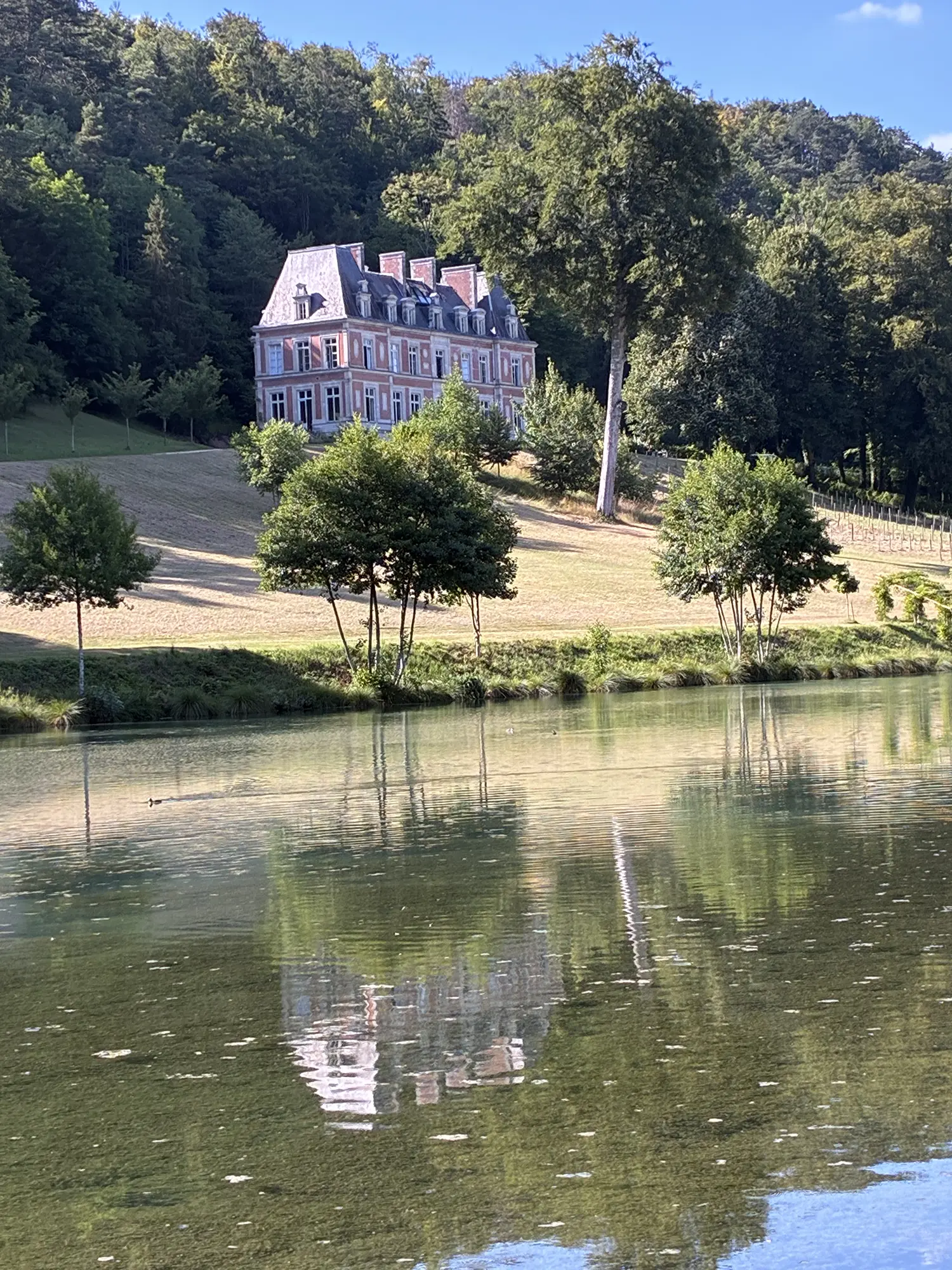 Again, nothing could adequately prepare me for the sheer magic of this magnificent palace set atop rolling hills covering over 40 acres of lush landscape, rippling streams andcows grazing in pasture. The grape vines that have been planted for wine, will be appearing by next summer butare still in their infancy.They are currently covering the hill facing the Chateau. This was my view, while overlooking newly planted young trees adorning the path leading to the lake. Sitting at my desk in a salon called Esthers Bath, I am surrounded by fellow writers, all creating and commiserating about their work, their life, and this otherworldly experience that we are sharing. Time has indeed stood still.